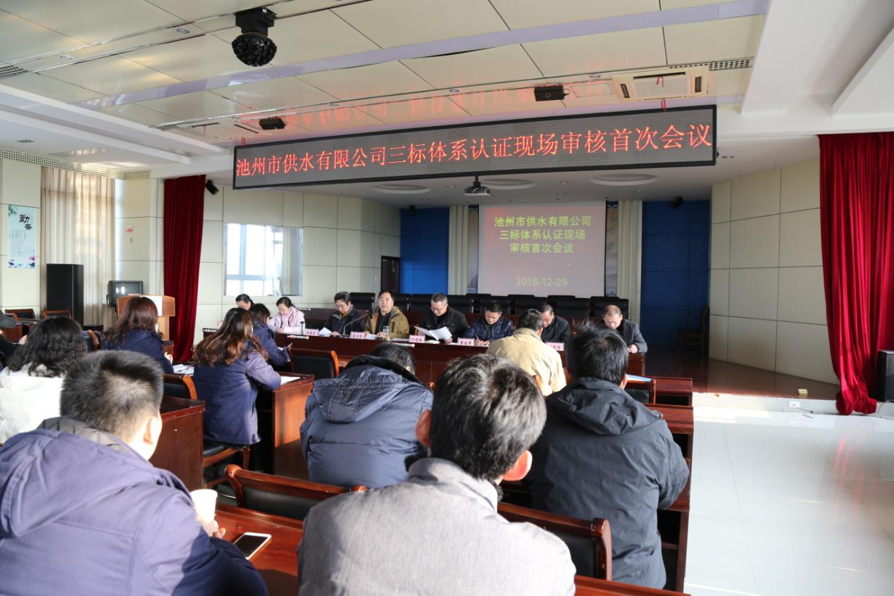 2016年12月29-31日,經過第三方上海恩可埃認證有限公司專家為期三天的審核,池州市供水有限公司“三標一體”管理體系即質量、環境、職業健康安全管理體系運行符合標準要求,順利通過認證審核,正式獲得“三標一體”管理體系認證。