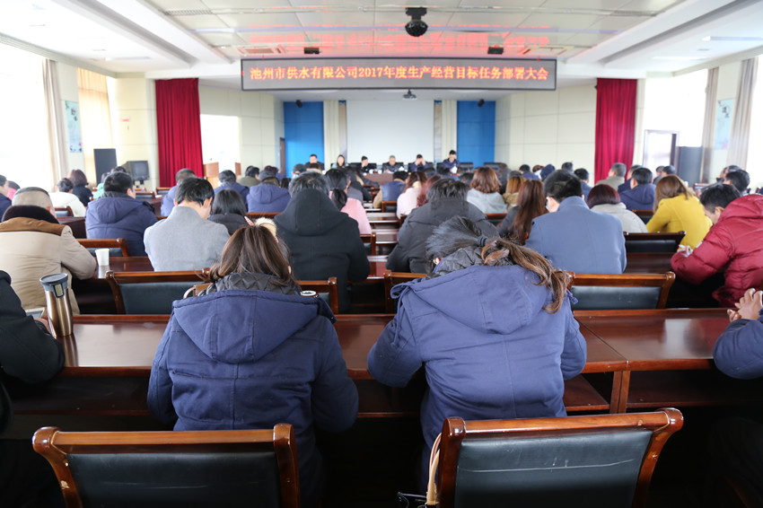 2017年2月10日,池州市供水公司在公司四樓會(huì)議室召開(kāi)2017年生產(chǎn)經(jīng)營(yíng)目標(biāo)任務(wù)部署大會(huì)。公司董事長(zhǎng)鐘誠(chéng)、總經(jīng)理吳小平等全體高管及公司全體員工參加會(huì)議。