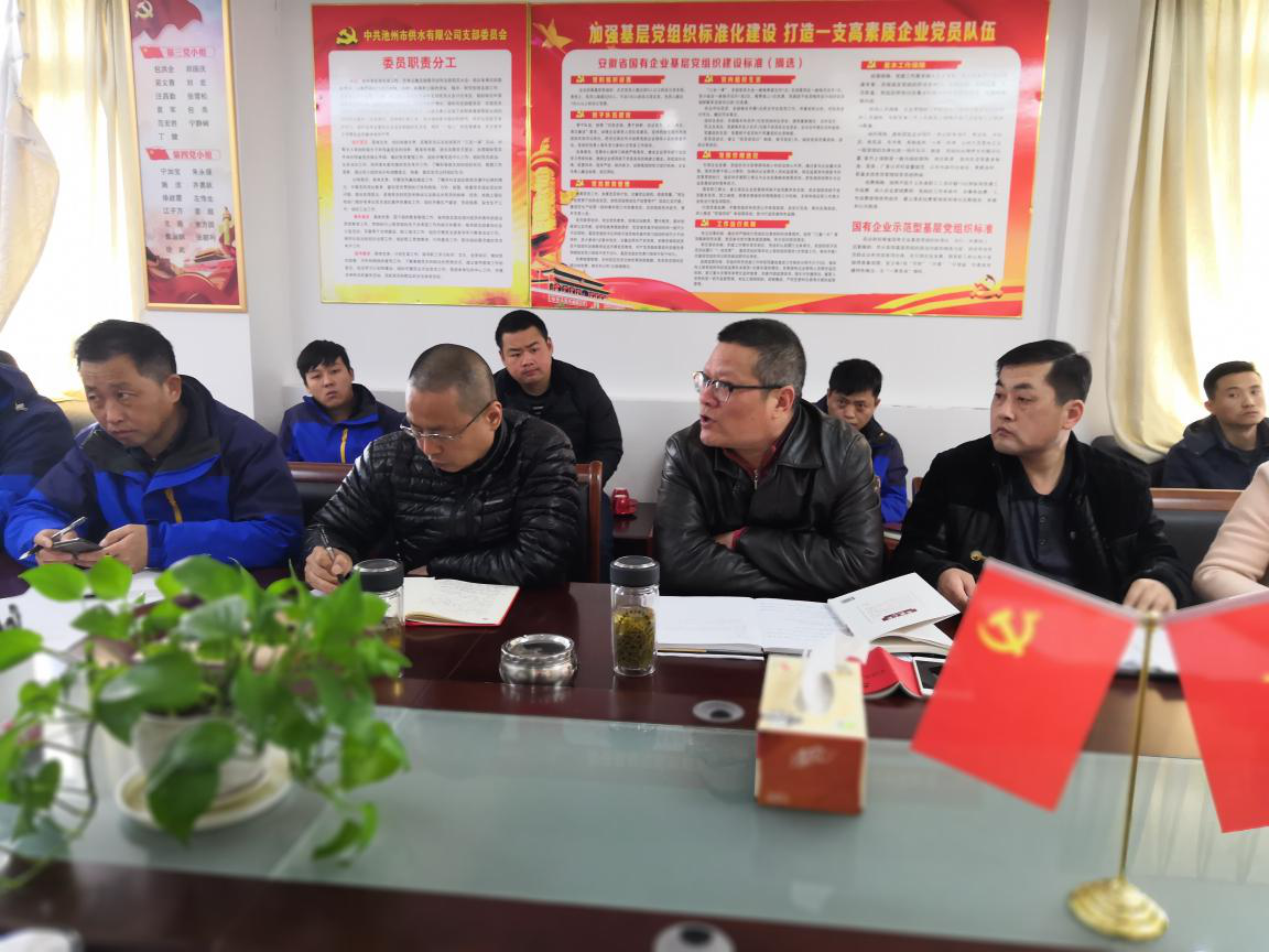 2018年3月21日,池州市供水有限公司召開全體黨員大會,深入學習兩會精神,對貫徹落實兩會精神進行部署。黨支部書記、公司董事長鐘誠同志和建投黨委委員、公司總經理吳小平同志參加了會議。