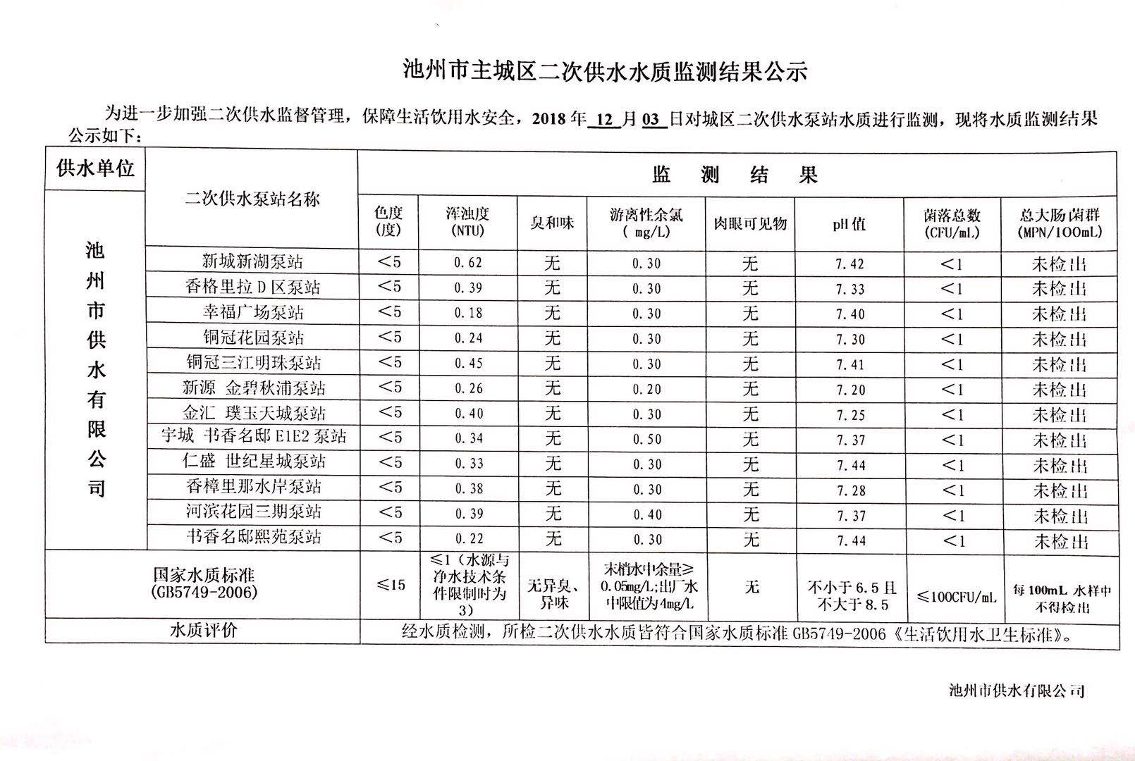 | 池州市主城區二次供水水質監測結果公示(2018.12.03) | |
