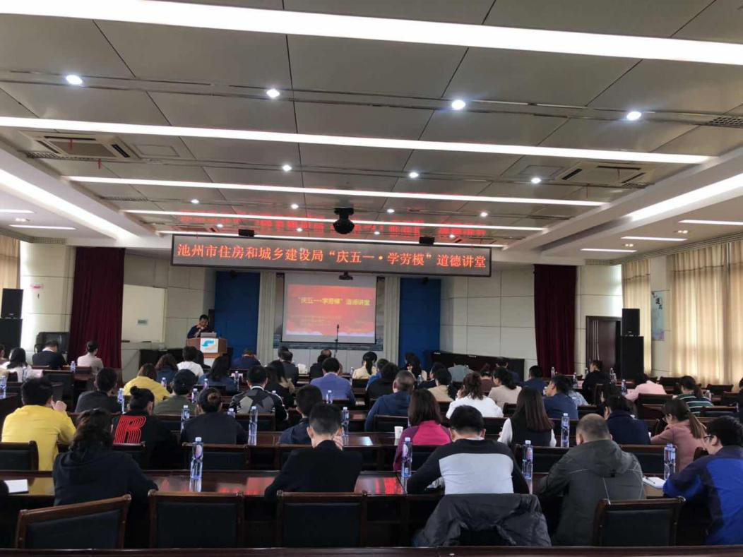 為弘揚勞模精神、勞動精神、工匠精神,營造學習典型、創先爭優的濃厚氛圍,4月26日下午,市住房和城鄉建設局機關黨委、市建設建材工會主辦、市供水有限公司承辦了以“慶五一·學勞模”為主題的道德講堂活動。池州市住房和城鄉建設局黨組副書記、副局長余祖平、總工會調研員趙桂萍、市文明辦副調研員王家才、市建設建材工會主席方學松出席活動,局管、局屬各單位黨員代表、團員代表和基層工會職工代表以及房地產、建筑行業企業代表共計80余人參加了本次活動。