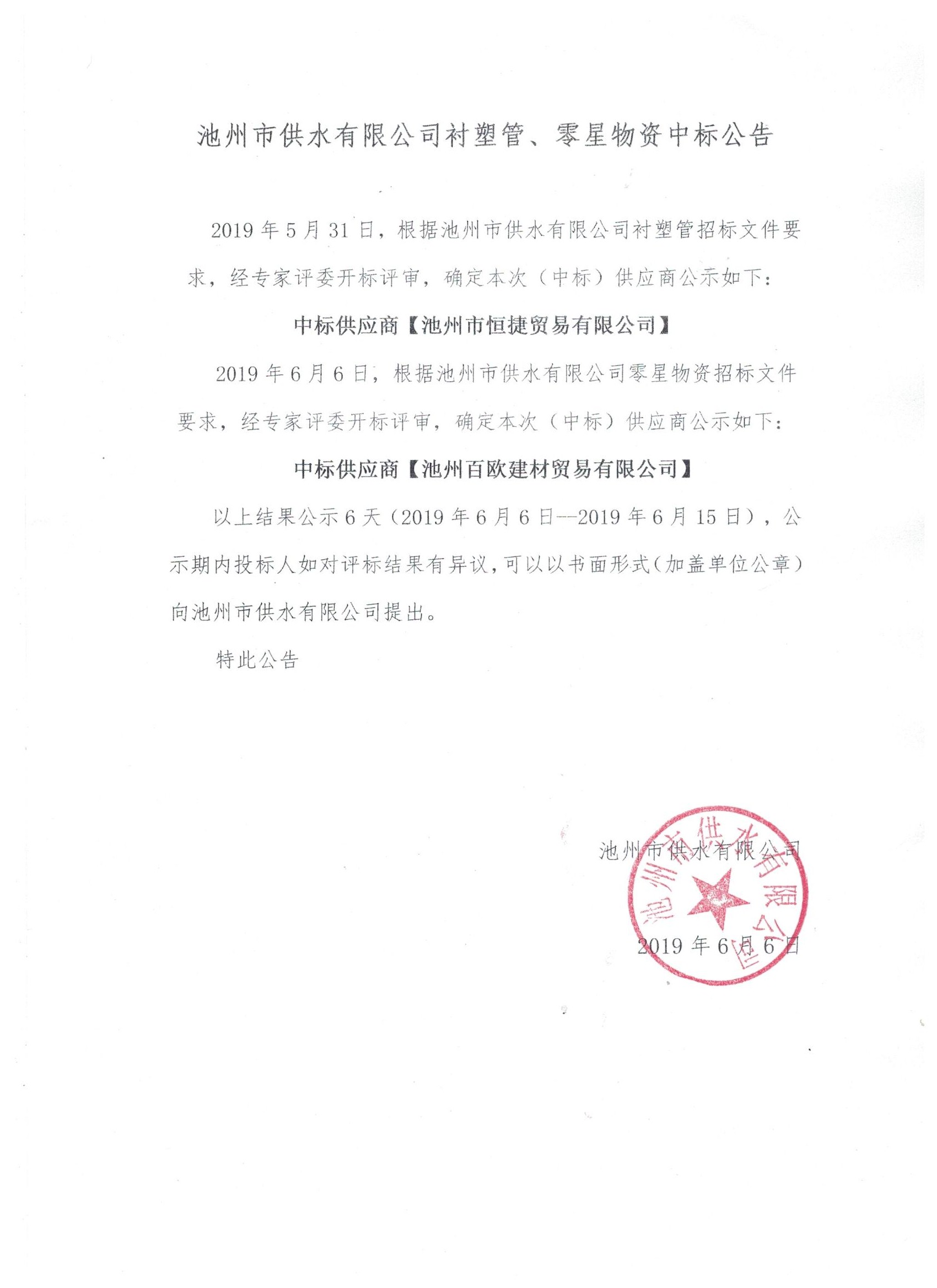 | 池州市供水有限公司襯塑管、零星物資中標公告 | |