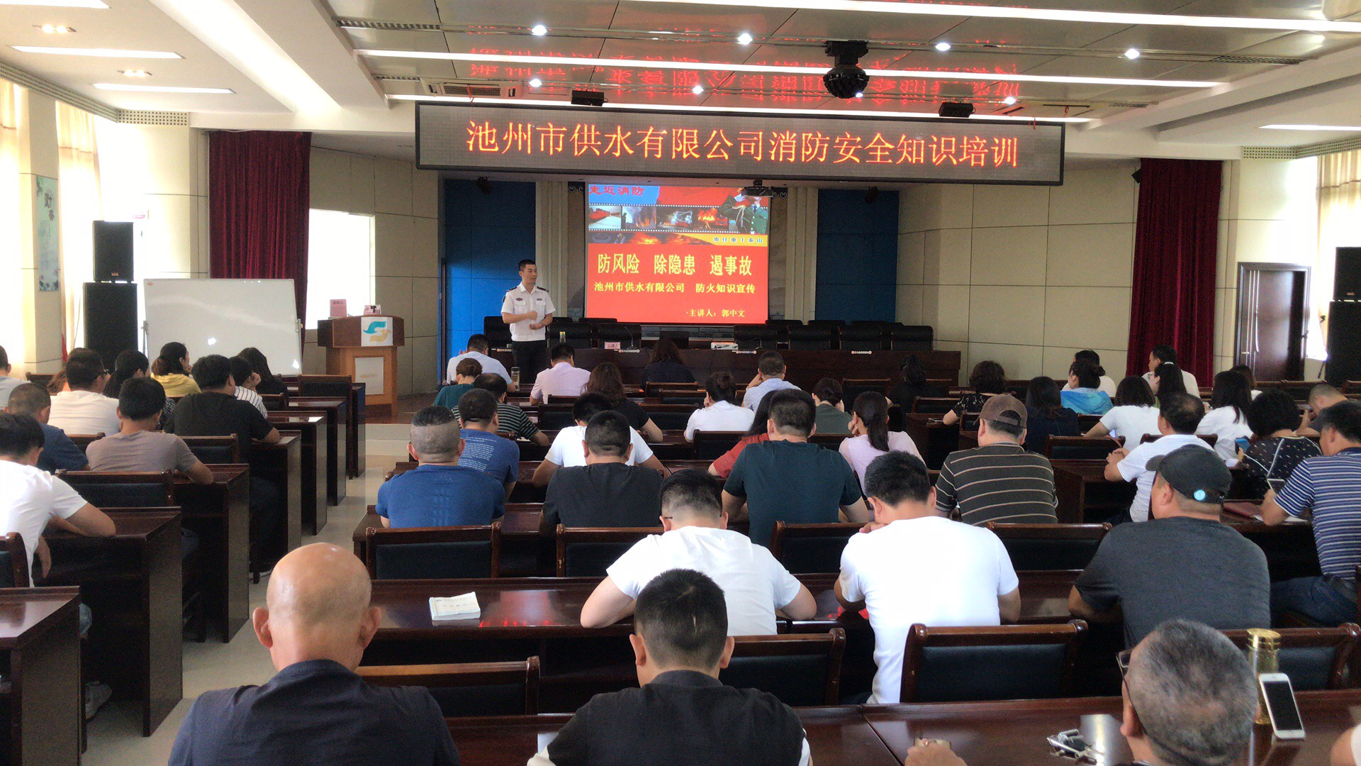 為進一步增強公司全體員工的消防安全意識,普及消防安全知識,推進公司的消防安全宣傳工作,2019年6月12日,池州供水有限公司邀請貴池區市安消防知識培訓服務中心郭教官為公司員工開展消防安全培訓講座。