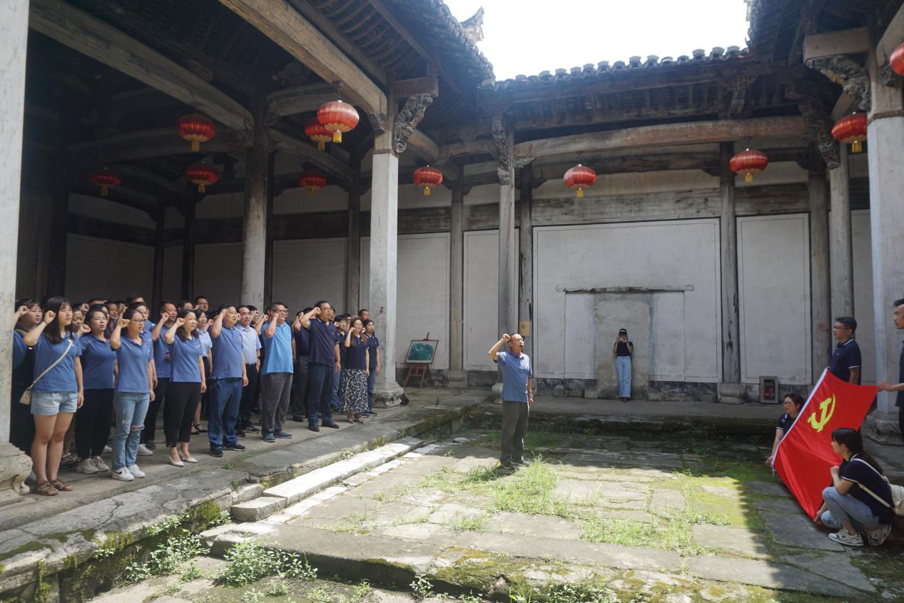 參觀完家風家訓館后,大家前往陵陽鎮北上抗日先遣隊駐地舊址。這里既是陳氏宗祠也是抗日先遣隊駐地舊址,1934年12月,紅軍北上抗日先遣隊曾在此宿營,司令部就設在陳氏宗祠中。大家認真觀看一組組珍貴的歷史圖片和文獻資料,體會這棟古建筑里不屈不撓艱苦奮斗的時代痕跡,切身感受革命先烈對黨忠誠、無私奉獻、不懼犧牲的革命精神,全體黨員深受震撼,思想上受到一次深刻的洗禮。最后,在供水公司黨支部書記鐘誠的帶領下,全體黨員一道舉起右拳、面對黨旗、莊嚴宣誓。“我志愿加入中國共產黨,擁護黨的綱領,遵守黨的章程……永不叛黨。”一字一句,鏗鏘有力,愛國愛黨之情油然而生。