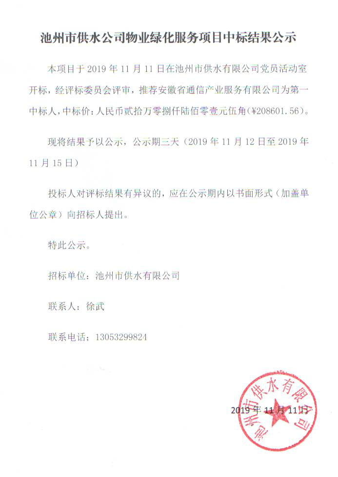 | 池州市供水公司物業(yè)綠化服務(wù)項(xiàng)目中標(biāo)結(jié)果公示 | |