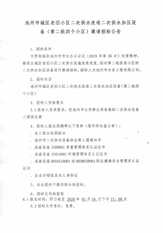 | 池州市城區老舊小區二次供水改造二次供水加壓設備(第二批四個小區)邀請招標公告 | |