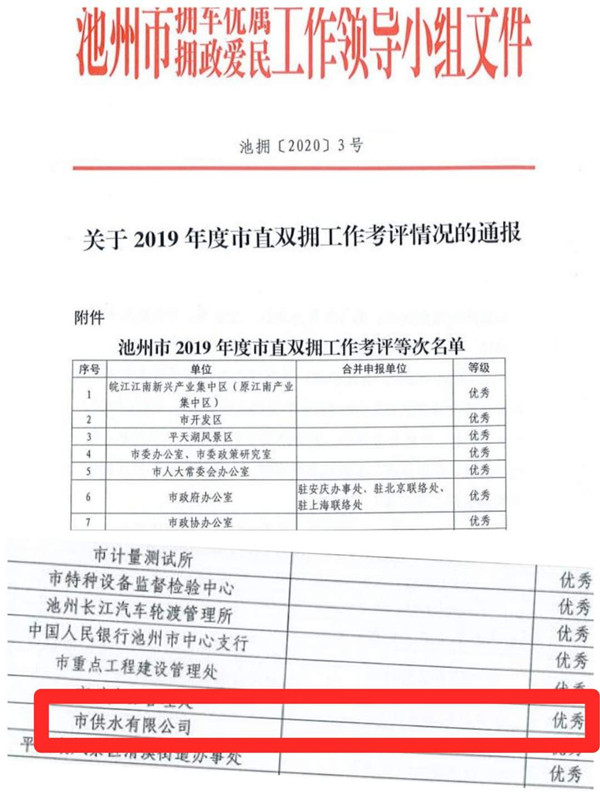 近日,池州市雙擁辦傳來(lái)好消息,池州市供水有限公司獲池州市2019年雙擁優(yōu)秀單位稱(chēng)號(hào),這是公司自2017年申報(bào)市雙擁優(yōu)秀單位以來(lái)連續(xù)三屆獲此殊榮。