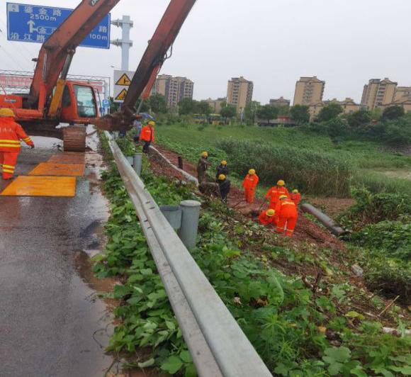 7月7日清晨,公司總經理李張兵冒雨親臨施工現場。搶修人員早早施工圍擋、指示牌及反光錐等布置妥當,以確保搶修人員以及行人安全。因爆裂管道為DN600球墨鑄鐵給水管道,管徑大,人工操作困難,需要大型挖掘機,公司提前調度機械趕赴現場,搶修工作有條不紊迅速展開。