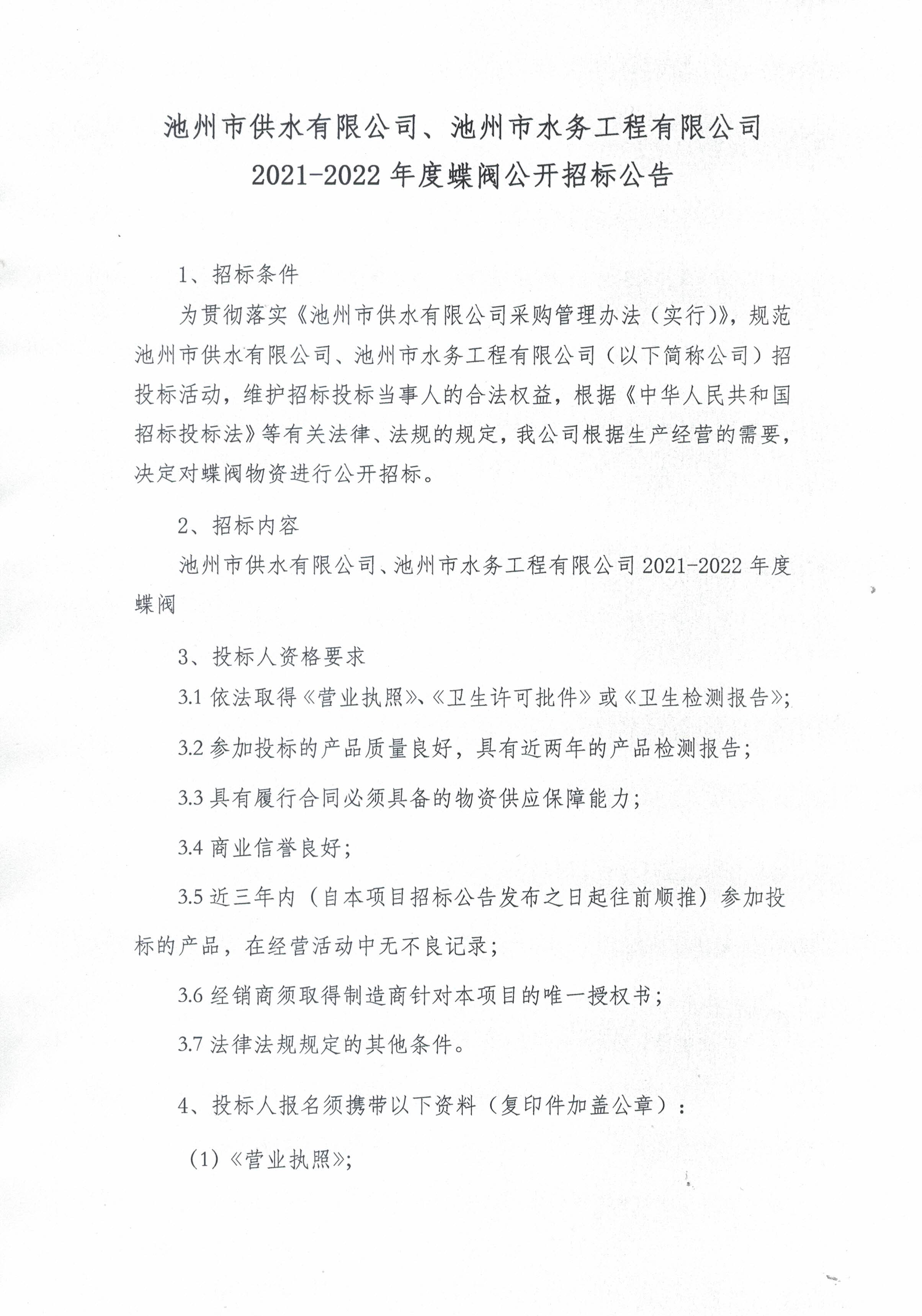 | 池州市供水有限公司、池州市水務(wù)工程有限公司2021-2022年度蝶閥公開招標(biāo)公告 | |