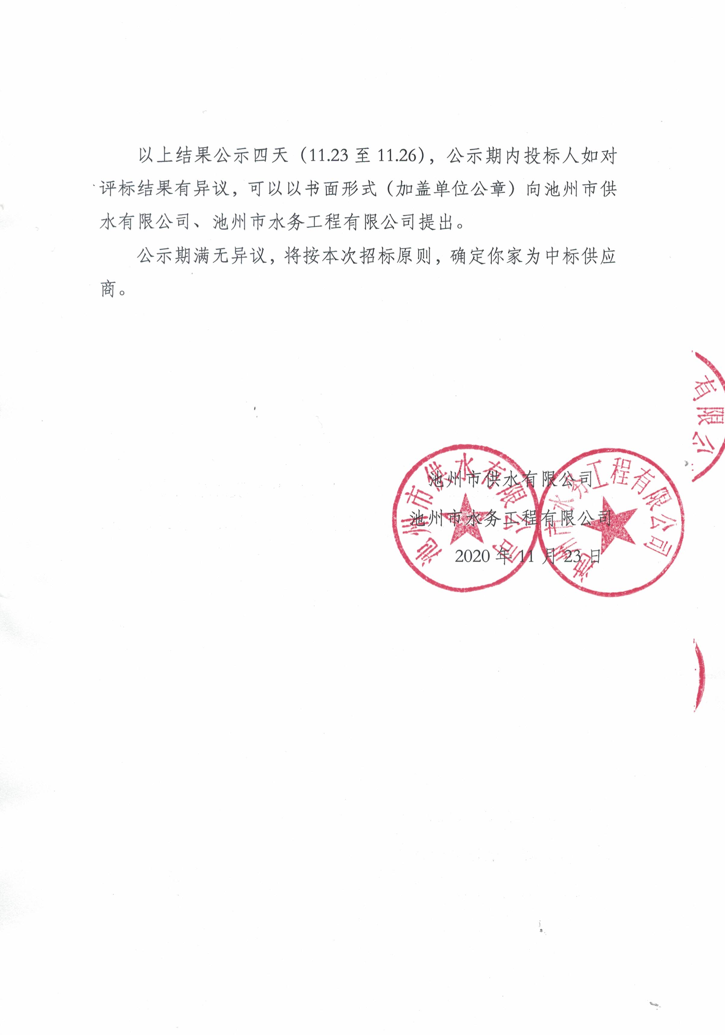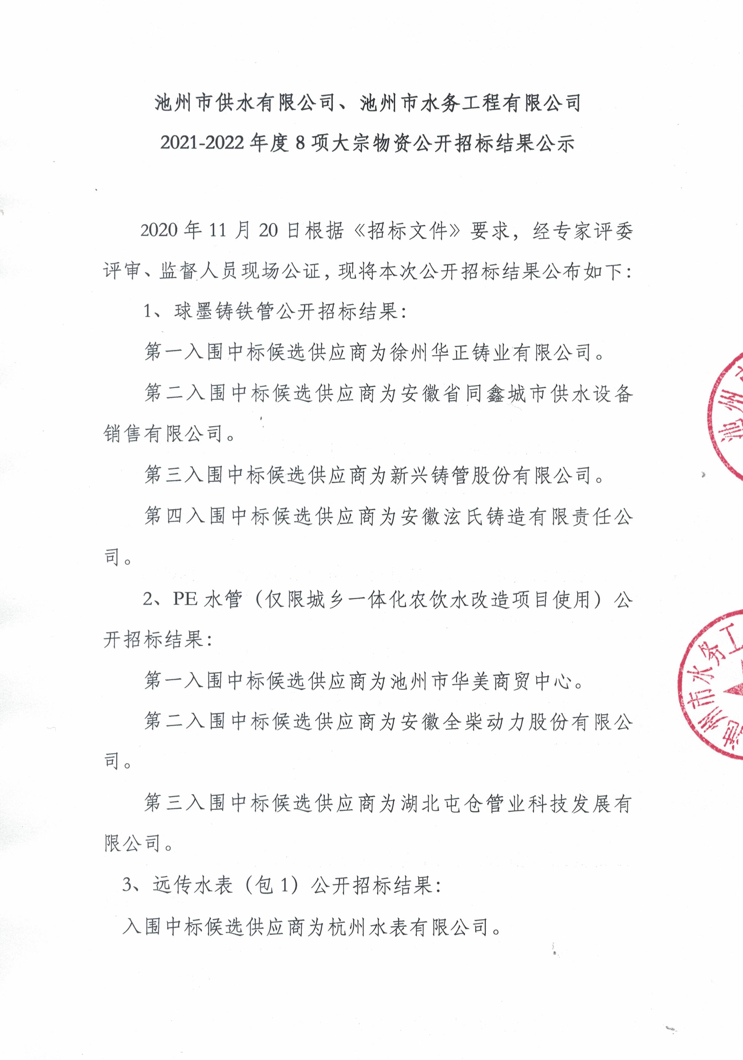 | 池州市供水有限公司、池州市水務工程有限公司2021-2022年度8項大宗物資公開招標結果公示 | |