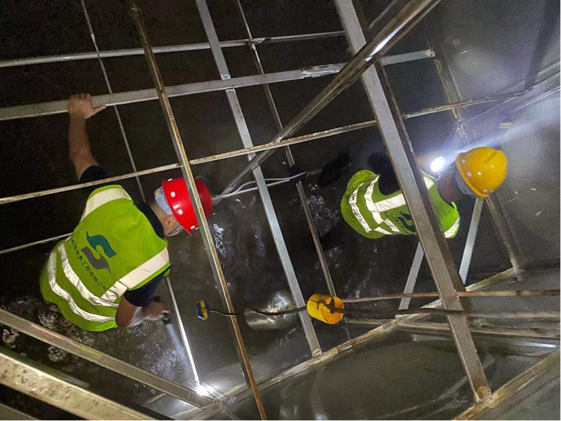 G318墩上收費站的泵房已有較長時間未進行專業清洗消毒,泵房不銹鋼水箱體積較大。為保證有限空間作業安全,黨員志愿者們通過對水箱內部通風換氣等方式,在保障水箱內部安全的前提下,用水槍對水箱內壁進行反復清洗、排放、消毒。在志愿者們的努力下,徹底將不銹鋼水箱清洗干凈,并將清洗情況詳細告知收費站管理人員,指導他們泵房日常維護保養和清洗消毒方面的知識,確保日常飲用水安全。