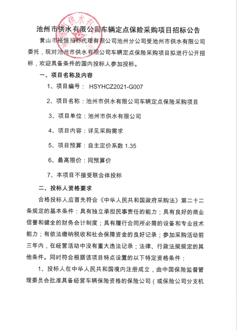 | 池州市供水有限公司車(chē)輛定點(diǎn)保險(xiǎn)采購(gòu)項(xiàng)目招標(biāo)公告 | |