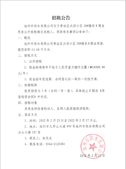 | 池州市供水有限公司興濟(jì)小區(qū)30號(hào)樓東8門(mén)面房出租公告 | |