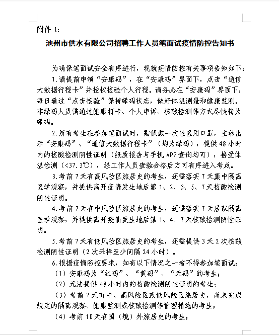 附件:1、池州市供水有限公司招聘工作人員筆面試疫情防
