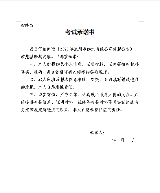 3、報名方式:采取現(xiàn)場報名方式。報考人員報名前,應(yīng)通過“皖事通”APP實(shí)名申領(lǐng)“安康碼”,認(rèn)真閱讀《池州市供水有限公司招聘工作人員筆面試疫情防控告知書》(附件1),落實(shí)考試期間疫情防控相關(guān)要求。符合招聘條件人員,請攜帶本人有效身份證、學(xué)歷學(xué)位證書以及相關(guān)證書等材料原件及復(fù)印件,下載并填寫《考試承諾書》(見附件2)、《2022年池州市供水有限公司招聘工作人員報名表》(見附見3),同時提供近期2寸正面免冠照片1張辦理報名手續(xù)。每名報考人員限報一個崗位。審查通過者進(jìn)行入下一環(huán)節(jié)時間另行通知。