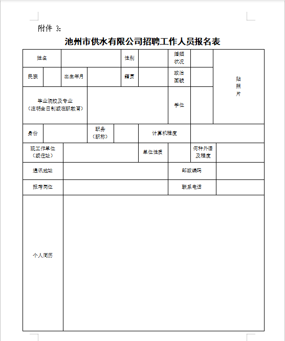 3、2022年池州市供水有限公司招聘工作人員報名表