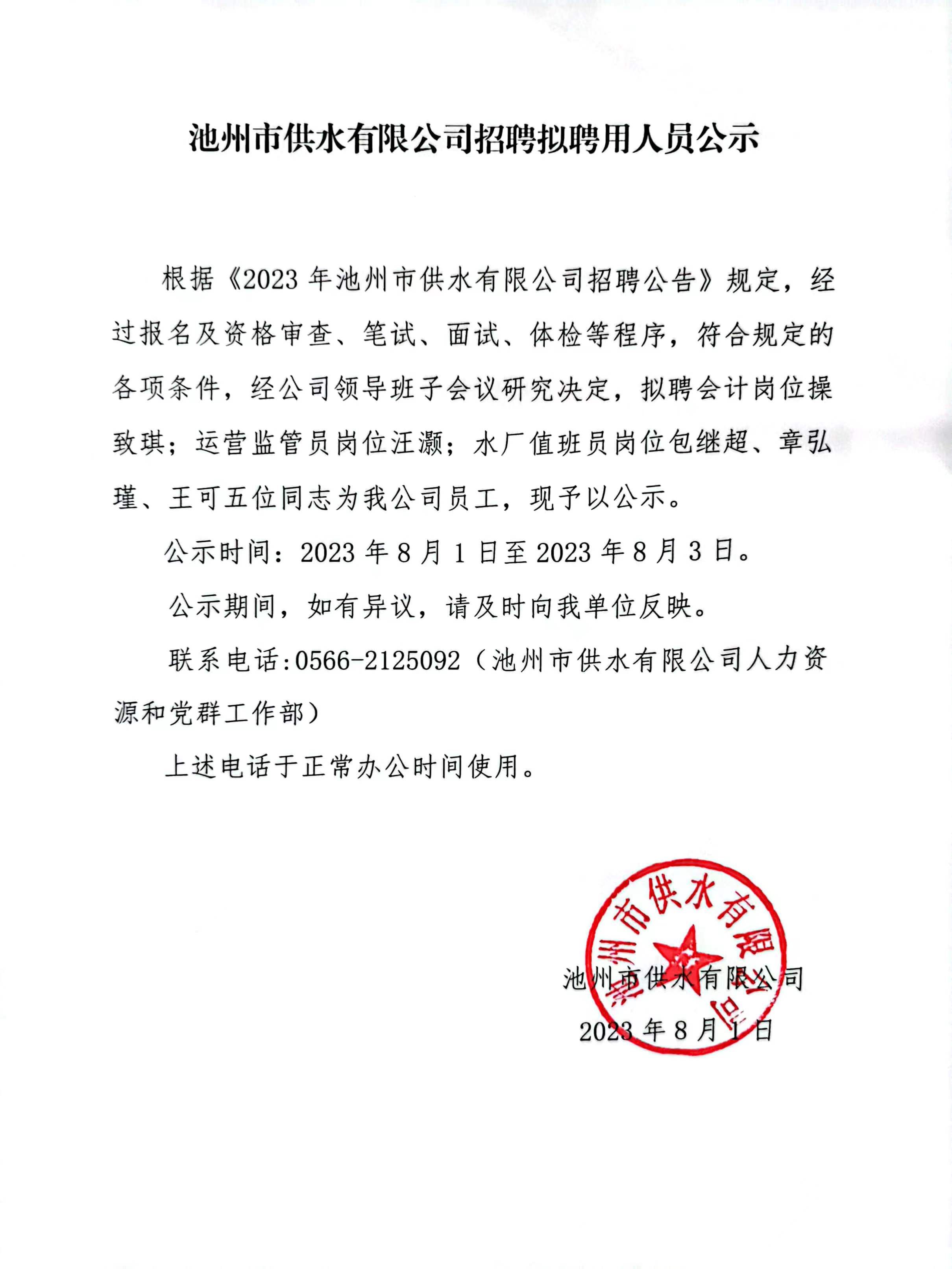 | 池州市供水有限公司招聘擬聘用人員公示 | |