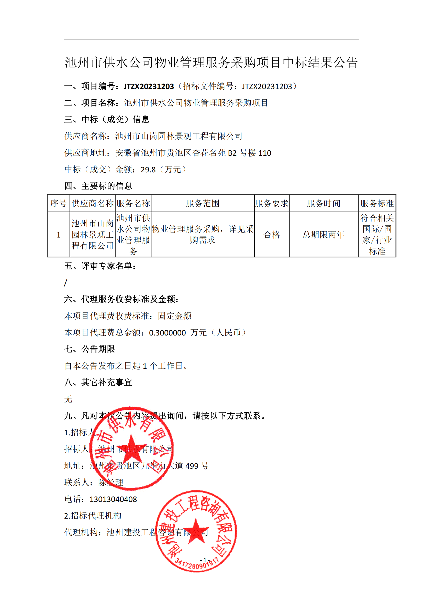 | 池州市供水公司物業管理服務采購項目中標結果公告 | |