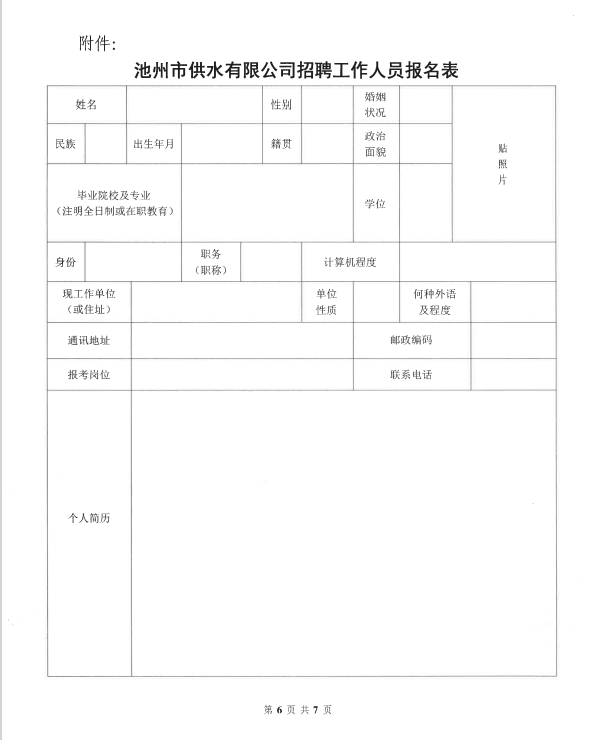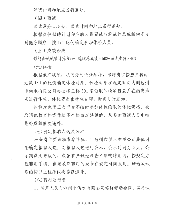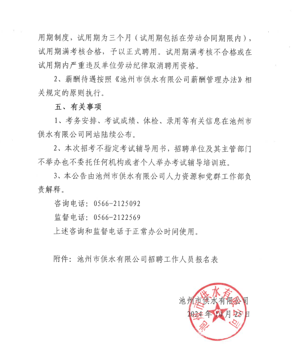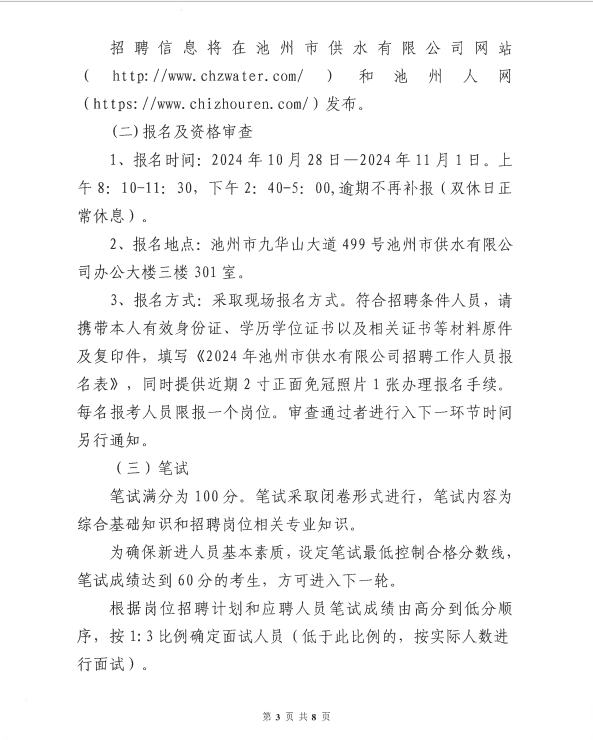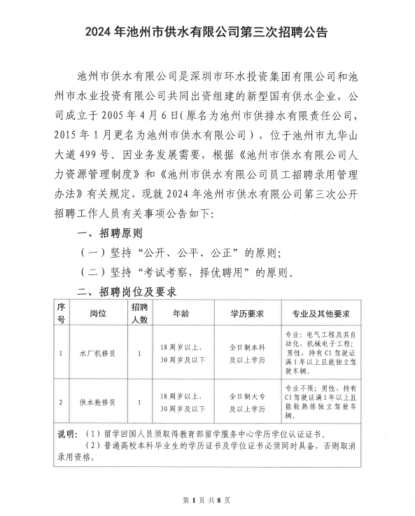 | 2024 年池州市供水有限公司第三次招聘公告 | |