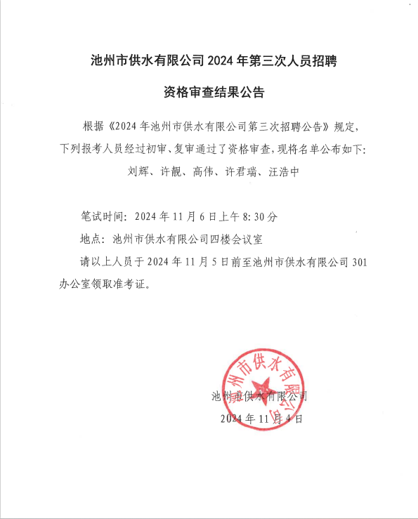 | 池州市供水有限公司2024年第三次招聘資格審查結果公告 | |