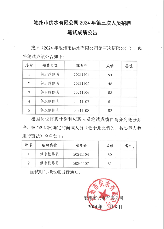 | 池州市供水有限公司2024年第三次人員招聘筆試成績公告 | |
