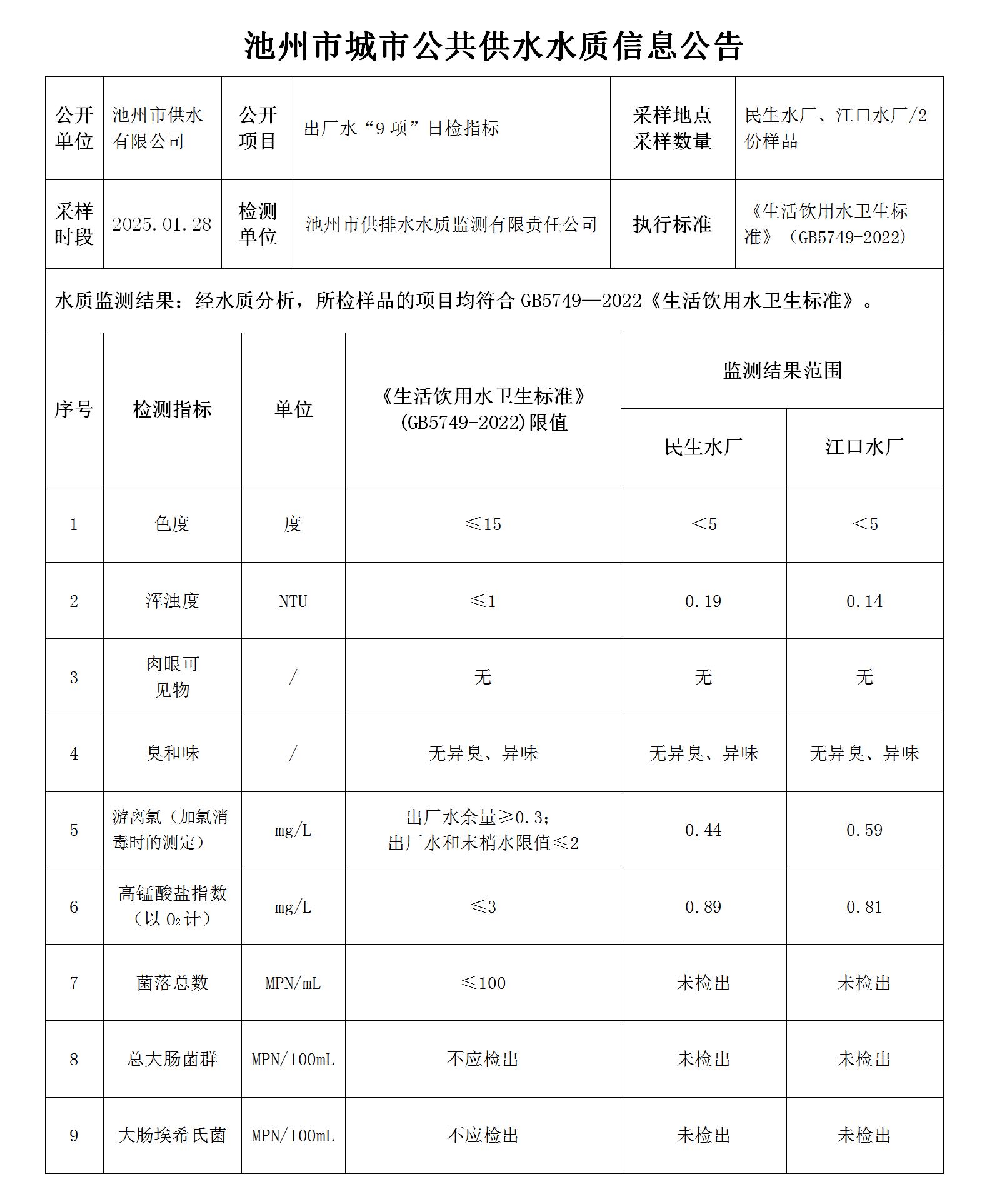 | 池州市城市公共供水水質信息公告出廠水“9項”日檢指標2025.01.28 | |