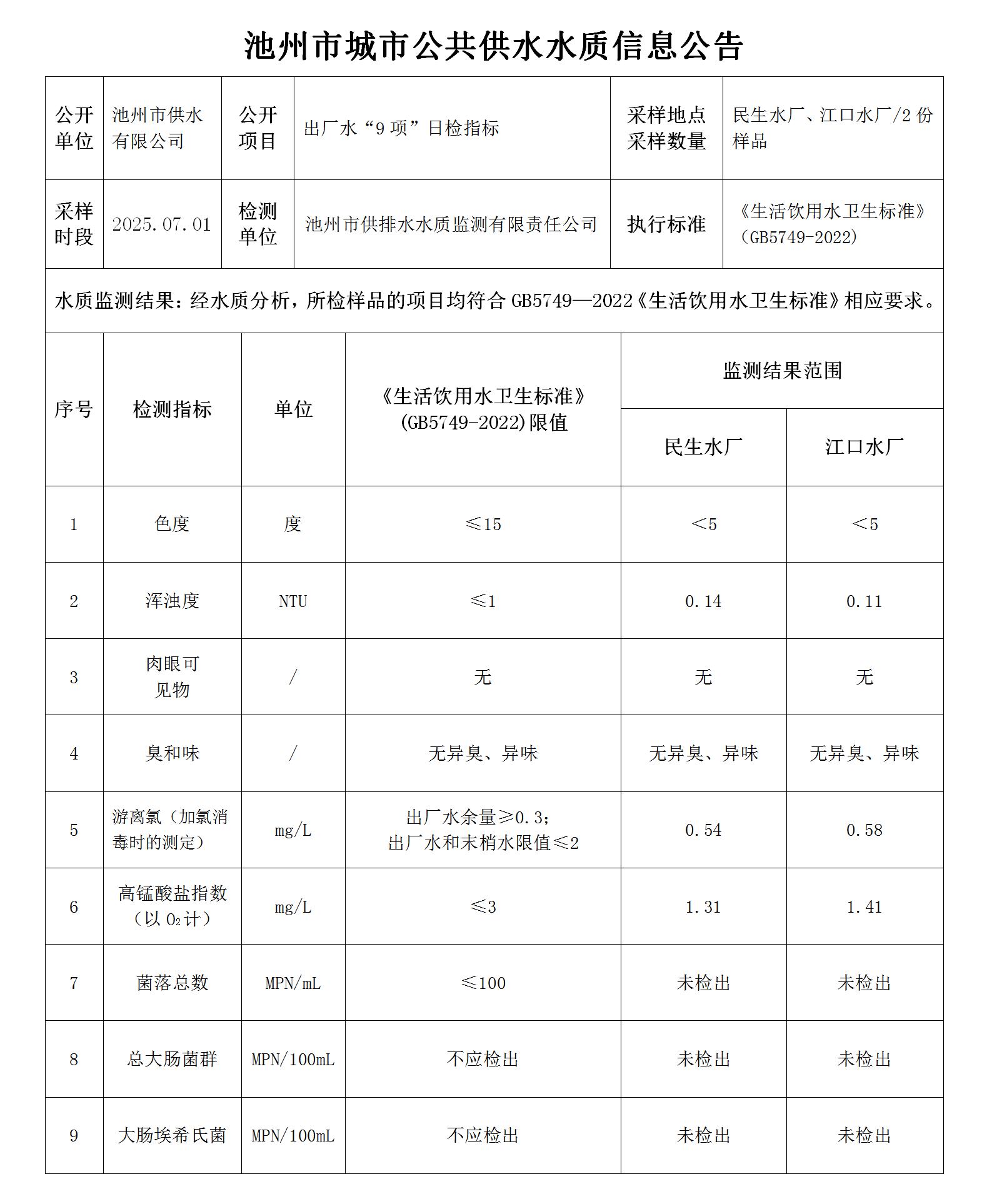 | 池州市城市公共供水水質信息公告出廠水“9項”日檢指標2025.07.01 | |