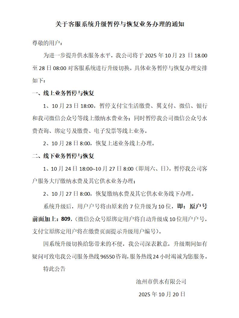 | 關(guān)于客服系統(tǒng)升級(jí)暫停與恢復(fù)業(yè)務(wù)辦理的通知 | |