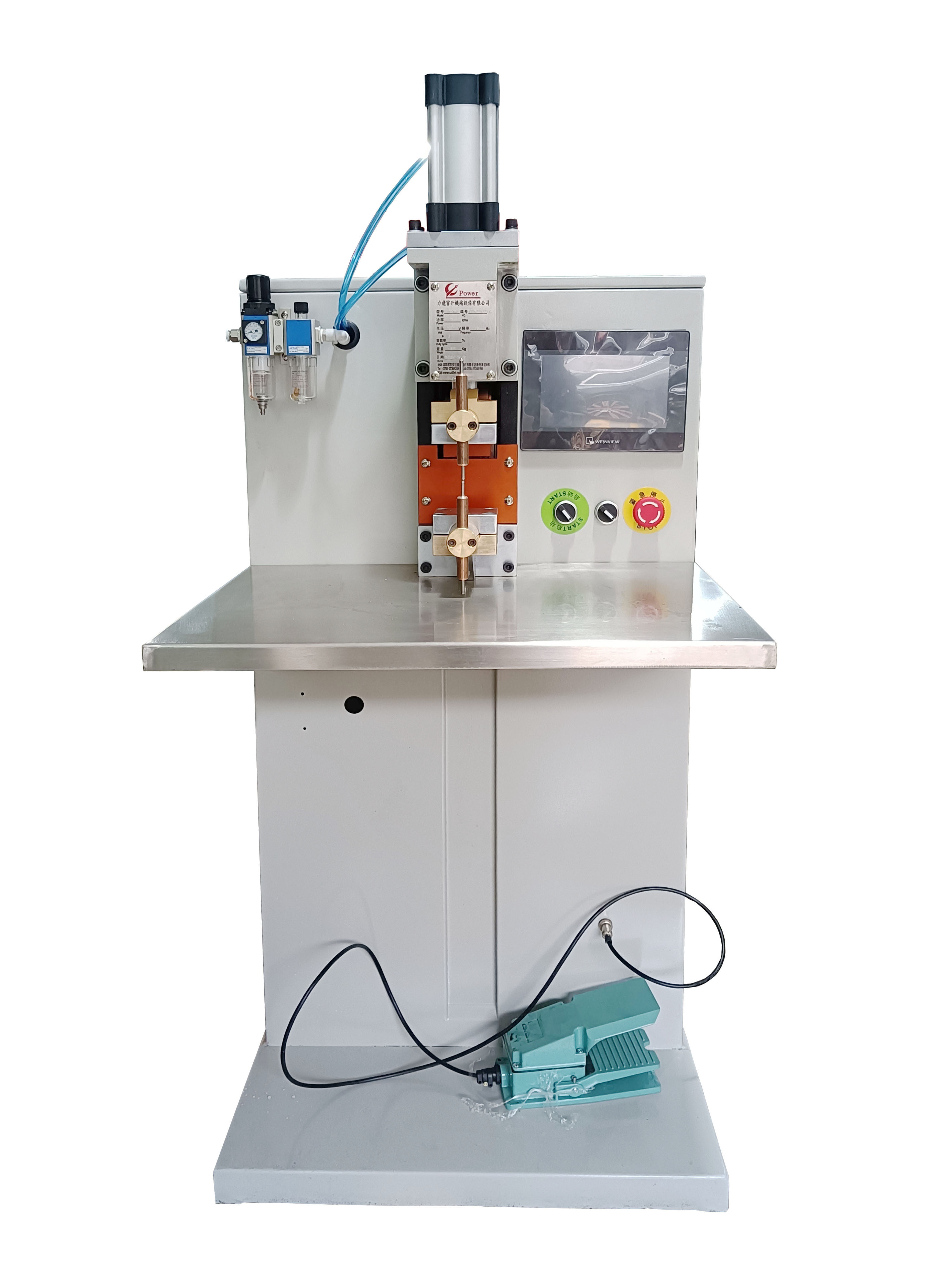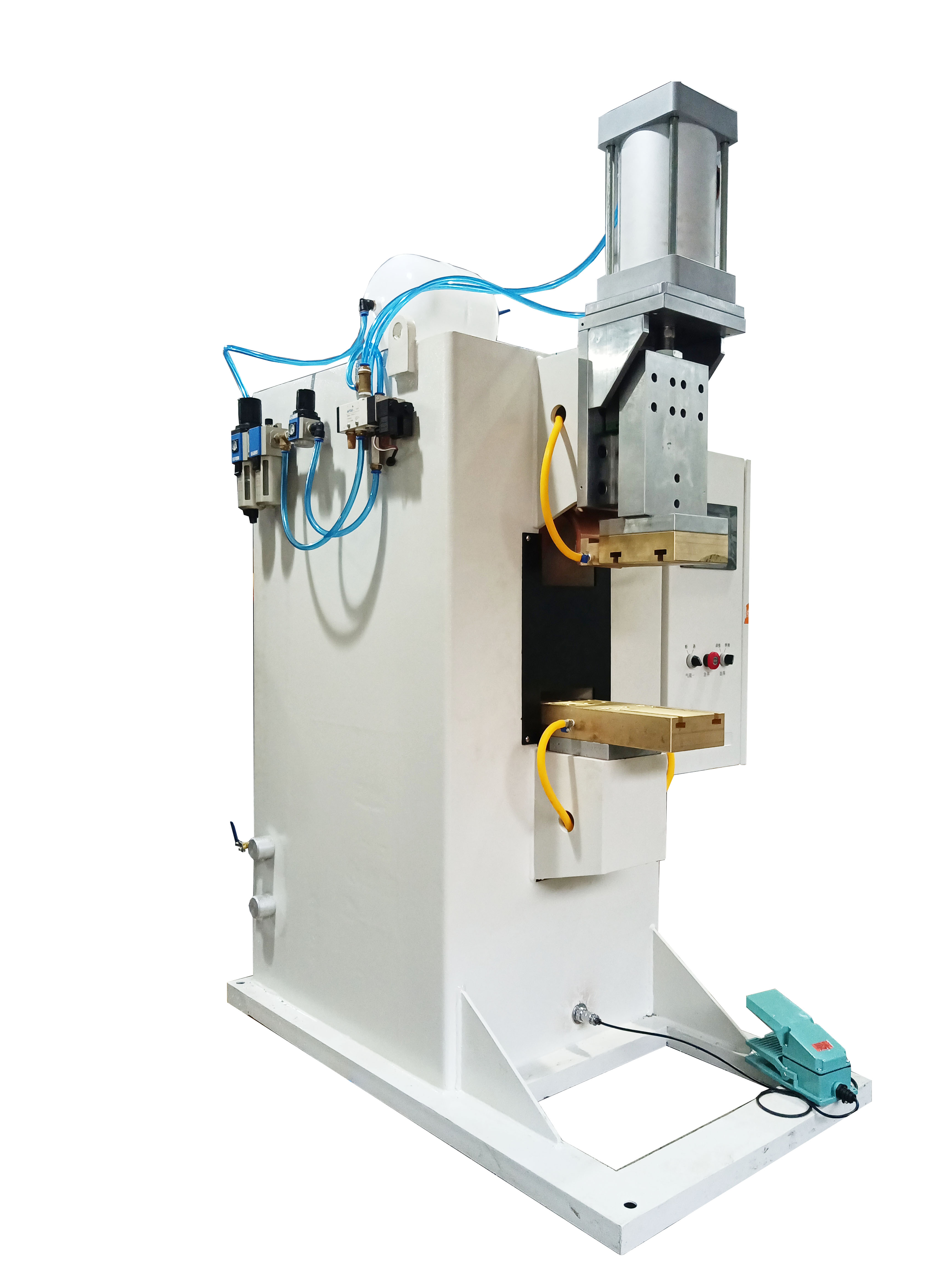傳動部分采用氣動加壓,能保證足夠的焊接壓力,通過四柱滾珠模架的精確導(dǎo)向確保上下電極的平整度。
