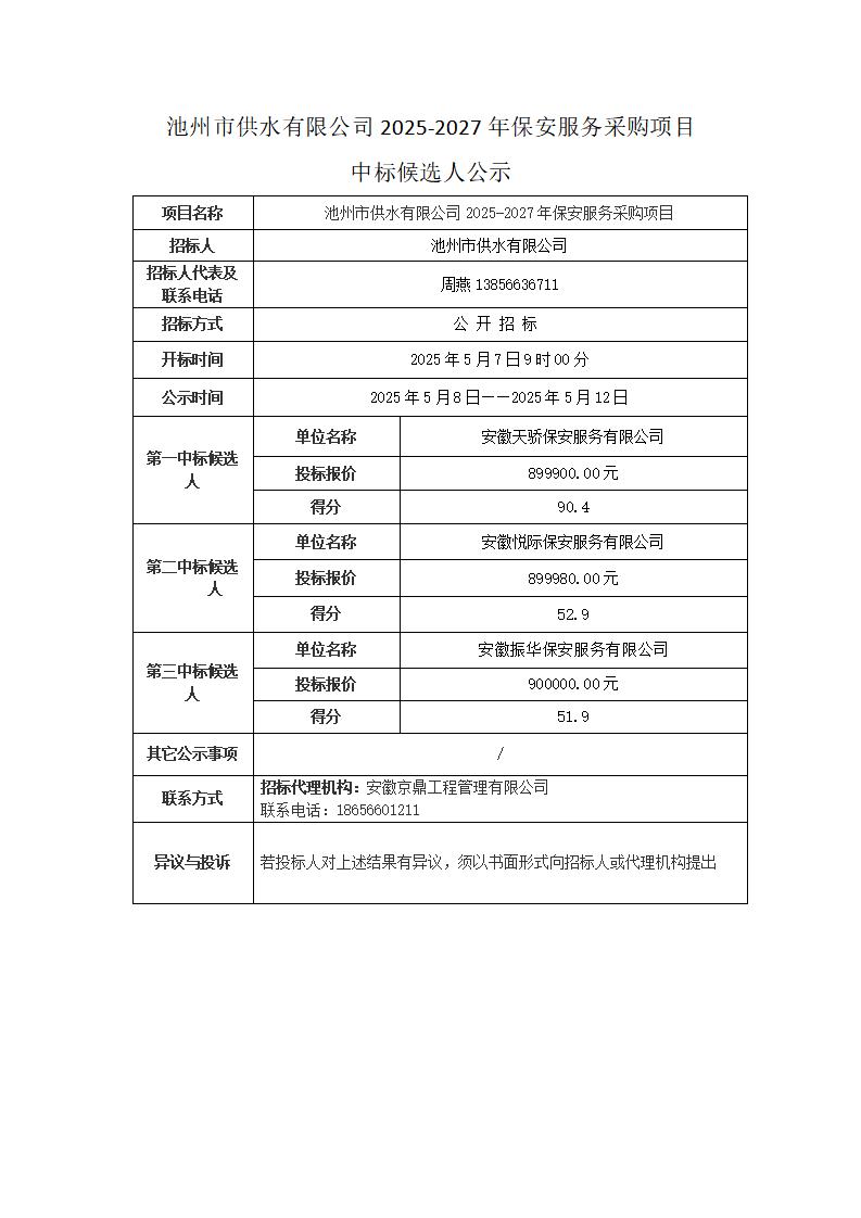 | 池州市供水有限公司2025-2027年保安服務(wù)采購項目中標(biāo)候選人公示 | |