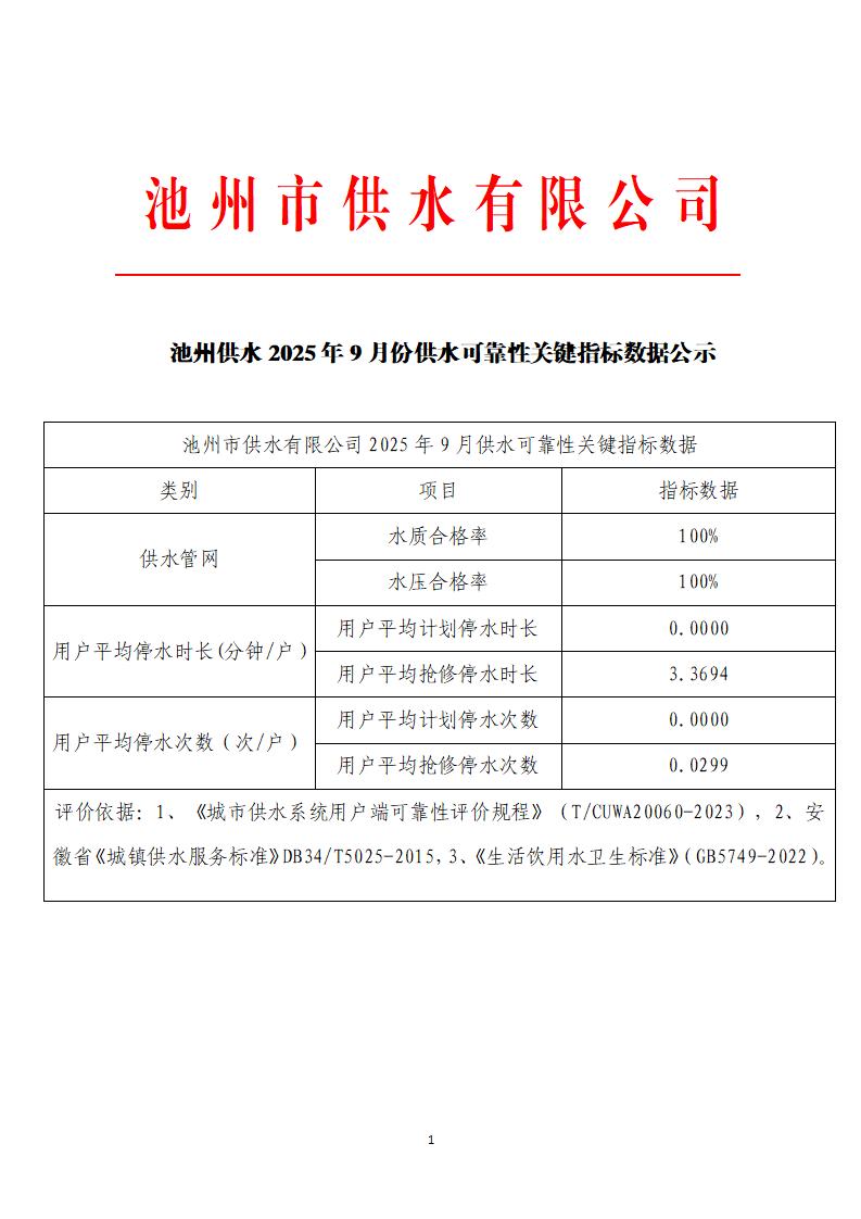 | 池州供水2025年9月份供水可靠性關鍵指標數據公示 | |